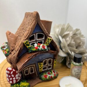Para usar aceite esencial hace falta poner una velita de tè encendida dentro de la casita y en la chimenea echar un poco de aqua y unas gotitas de aceites esenciales.Al estar encendida la velita,se calienta la chimenea y el aqua mezclada con aceite esencial empieza a evaporarse.El aroma se extiende por todo el hogar.