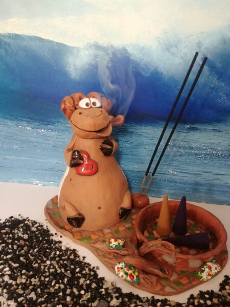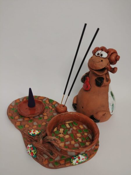 Sirve como objeto 3 en 1: para quemar cono incienso, incienso de barritas y, ademas, contiene una cajita para poner cosas pequeñas.Completamente hecho a mano.