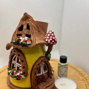 Para usar aceite esencial hace falta poner una velita de tè encendida dentro de la casita y en la chimenea echar un poco de aqua y unas gotitas de aceites esenciales.Al estar encendida la velita,se calienta la chimenea y el aqua mezclada con aceite esencial empieza a evaporarse.El aroma se extiende por todo el hogar.