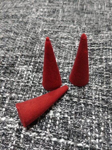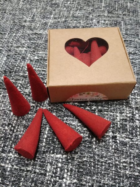 Conos de incienso de alta calidad,elaborados artesanalmente mediante la combinación de resinas naturales. Se venden en las cajitas de 10 unidades. Cada cono tiene una duración aprox.de una hora. Aroma: frutos rojos.