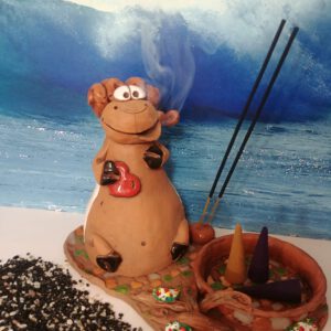 Sirve como objeto 3 en 1: para quemar cono incienso, incienso de barritas y, ademas, contiene una cajita para poner cosas pequeñas.Completamente hecho a mano.