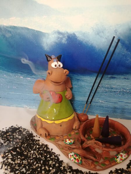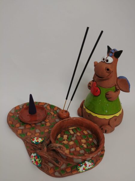 Sirve como objeto 3 en 1: para quemar cono incienso, incienso de barritas y, ademas, contiene una cajita para poner cosas pequeñas.Completamente hecho a mano.