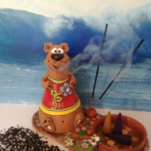 Sirve como objeto 3 en 1: para quemar cono incienso, incienso de barritas y, ademas, contiene una cajita para poner cosas pequeñas.Completamente hecho a mano.