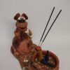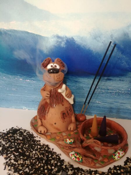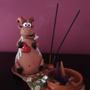 Sirve como objeto 3 en 1: para quemar cono incienso, incienso de barritas y, ademas, contiene una cajita para poner cosas pequeñas.Completamente hecho a mano.