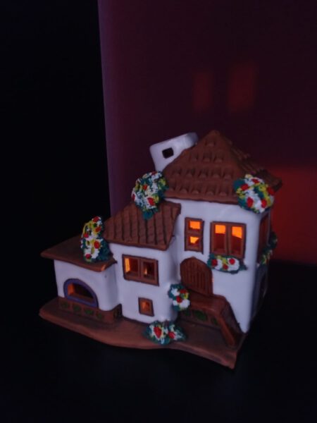 Para usar aceite esencial hace falta poner una velita de tè encendida dentro de la casita y en la chimenea echar un poco de aqua y unas gotitas de aceites esenciales.Al estar encendida la velita,se calienta la chimenea y el aqua mezclada con aceite esencial empieza a evaporarse.El aroma se extiende por todo el hogar.
