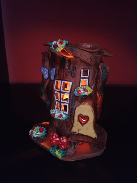 Para usar aceite esencial hace falta poner una velita de tè encendida dentro de la casita y en la chimenea echar un poco de aqua y unas gotitas de aceites esenciales.Al estar encendida la velita,se calienta la chimenea y el aqua mezclada con aceite esencial empieza a evaporarse.El aroma se extiende por todo el hogar.