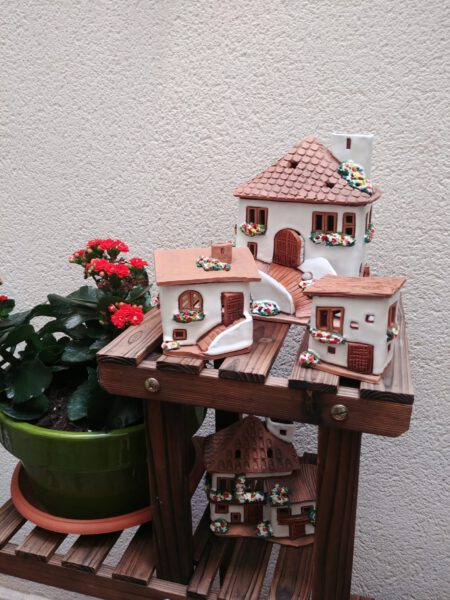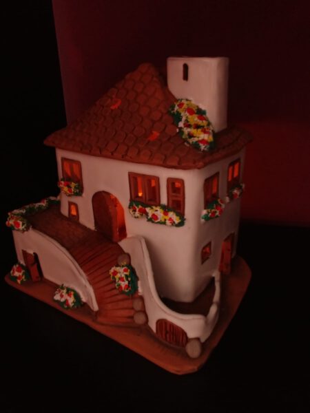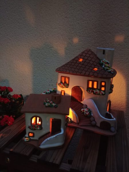 Para usar aceite esencial hace falta poner una velita de tè encendida dentro de la casita y en la chimenea echar un poco de aqua y unas gotitas de aceites esenciales.Al estar encendida la velita,se calienta la chimenea y el aqua mezclada con aceite esencial empieza a evaporarse.El aroma se extiende por todo el hogar.
